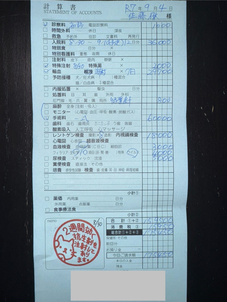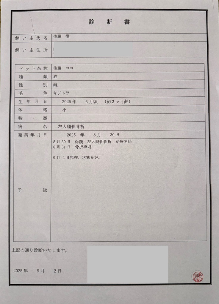 2025年8月30日怪我をして血まみれの子猫を見つけ飼い猫のかかりつけ医に持ち込みました。