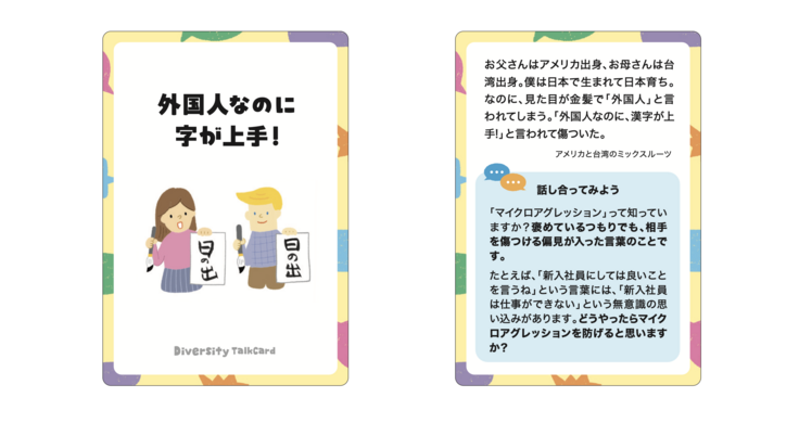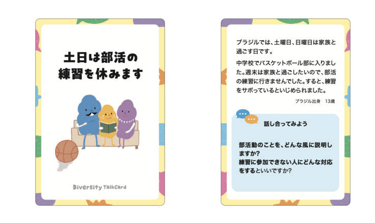 私たちは、子どもも大人も自然に「違い」について語り合える場をつくるために、「ダイバーシティ・トークカード」を開発しました。