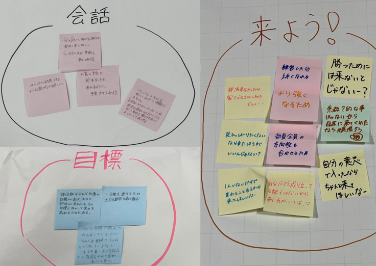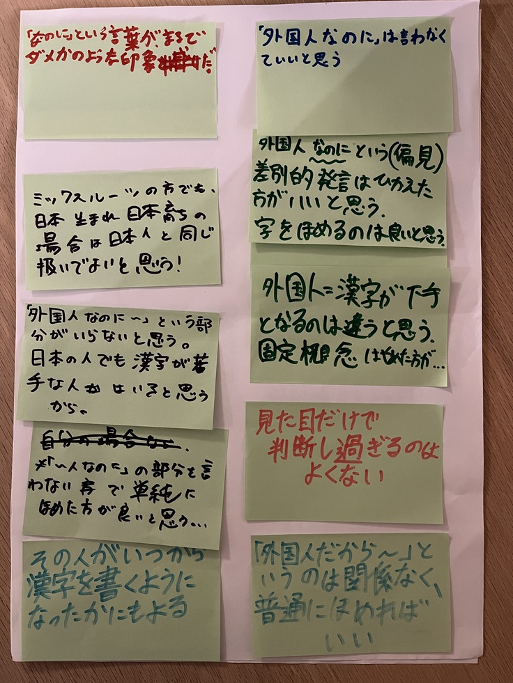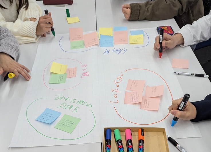 生徒たちはまず個人ワークで自分の意見や感想を付箋に書き出し、その後グループで一人ひとりが共有しました。