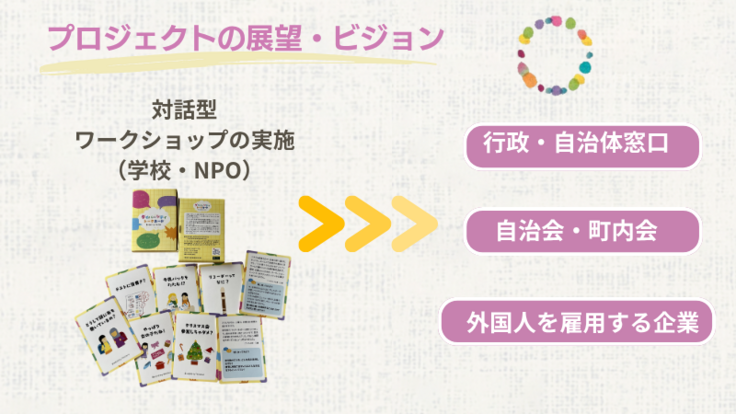 まずは学校現場から取り組みを広げ、将来的には地域や企業へと活用を拡大していきたいと考えています。対話の中で外国出身者の思いに触れることで、国籍や文化の違いを超え、人として共通する価値観に気づくこともできます。それは「分断が進む社会を変える一歩」になると信じています。