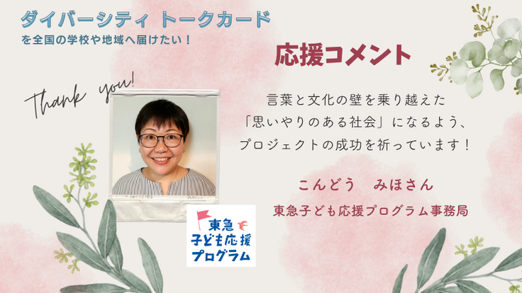 本プロジェクトを応援してくださる方々のメッセージをご紹介します。「ダイバーシティトーク」カードは、東急子ども応援プログラムの助成事業として誕生しました。東急子ども応援プログラム事務局の近藤様からのメッセージをご紹介します。