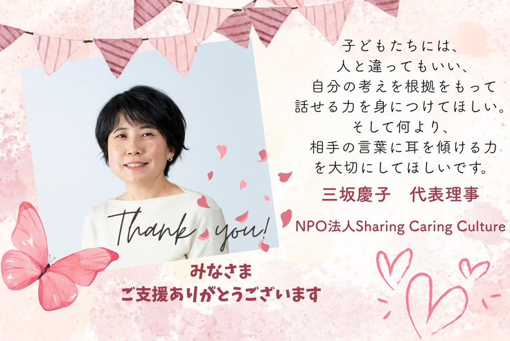 NPO法人Sharing Caring Culture代表理事の三坂慶子です。