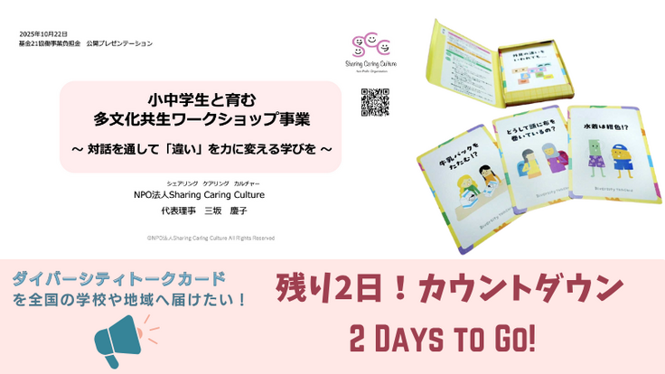 SCCは、神奈川県の令和8年度基金21協働事業の書類選考に通過し、10月22日に代表理事の三坂が、公開プレゼンテーションにて「ダイバーシティトークカードを用いた小中学生と育む多文化共生ワークショップ事業」を発表しました。その結果、県との協働にふさわしい事業として評価され、今後は神奈川県の国際課および教育局行政課と協議を進めていくことになりました。