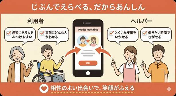 また、実際に担当するヘルパーさん本人の人となりや相性までは事前に確認できず、利用者の希望と実態に大きなズレが生じています。遠方の事業所が担当せざるを得ないなど、 地理的なミスマッチも発生しています。