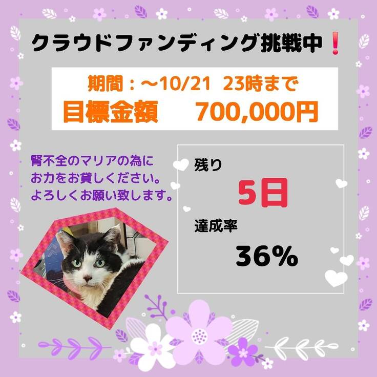 ただ、目標金額まではまだまだ遠くそんな中でのもうすぐカウントダウンに不安はいっぱいですが毎日頑張って腎不全と闘っているマリアの為に最後の最後まで諦めずに達成を信じて頑張ろうと思います💪