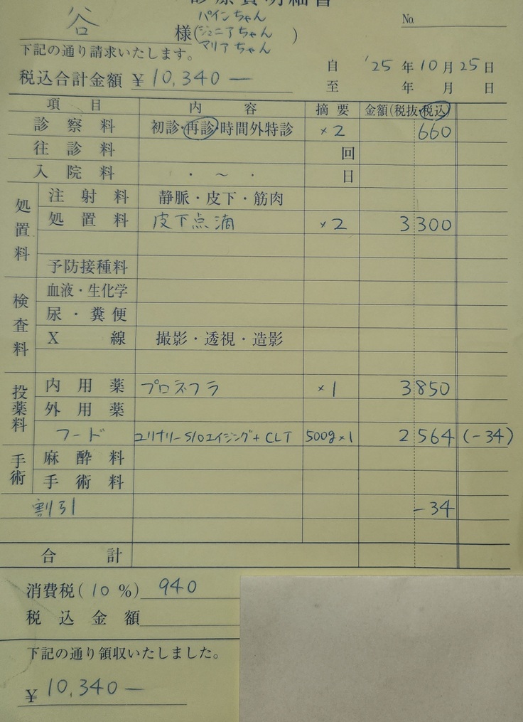 ★今日の領収書はパインのロイヤルカナンを購入した為、パインの名前も記載されています。