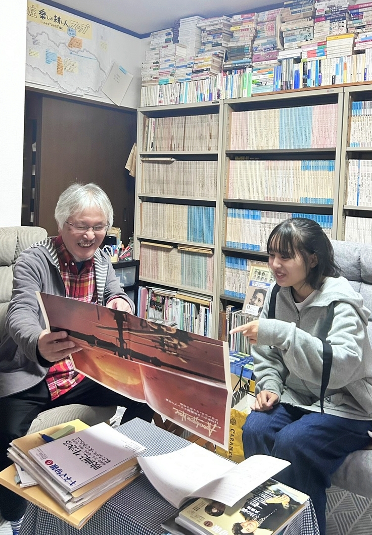 先日、映画サークル主宰で、インタビューの聞き手でもある福井県立大学2年生の新井日向子さんが、監修をお願いしている村上氏の資料室を訪問し、展示内容について具体的な相談を行いました。