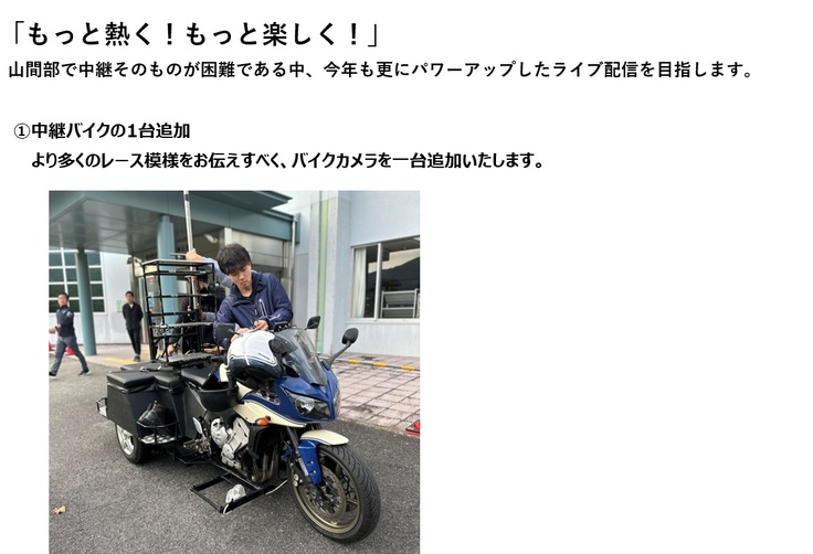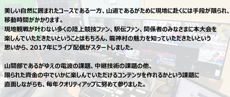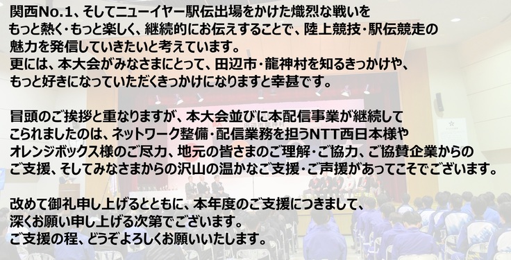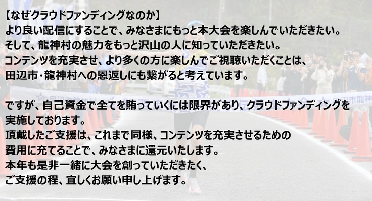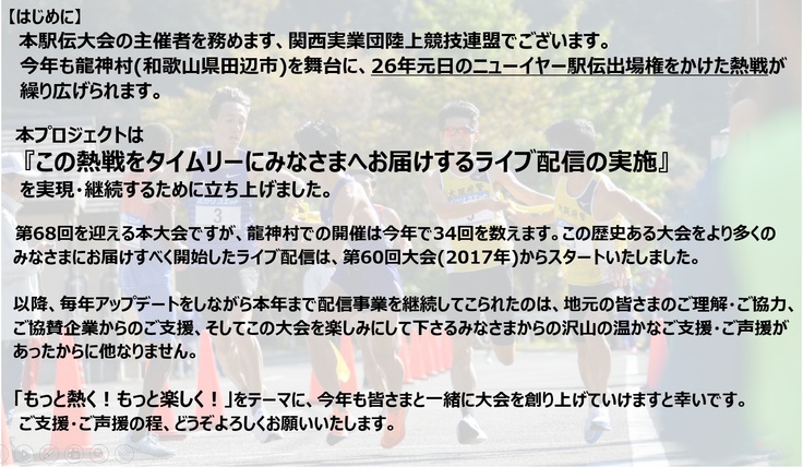 平素より当連盟事業へのご理解、ご協力を賜り、誠にありがとうございます。今年も龍神駅伝の季節がやって参りました。2017年よりスタートしたライブ配信は、多くの方々のご支援・ご協力に支えられ、山間部でありながら年を追うごとにクオリティを上げてお届けすることができております。今年も更なるクオリティアップを目指しており、本ライブ配信を通じて、実業団駅伝、そして龍神村の魅力をみなさまにお届けできればと思います。今年も本クラウドファンディングへのご支援を賜りますよう、何卒、宜しくお願い申し上げます。