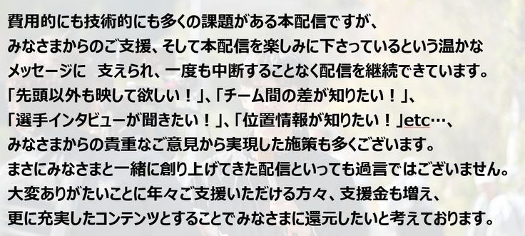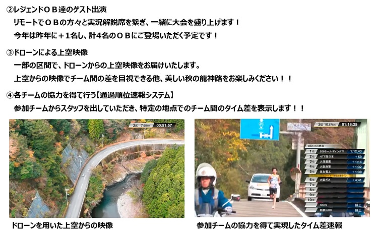 開催大会地元では、龍神の秋の風物詩として長く親しまれております。2017年からは、ライブ配信がはじまり、年々視聴も増えており、ここ龍神村の魅力が少しでも多くの方に届くことを期待しております。また、ライブ配信を通して龍神村に来て沿道にいる気分で応援いただけるとうれしいです。本クラウドファンディングにより関西実業団駅伝のライブ配信が継続していけるよう、ご協力をお願い申し上げます。