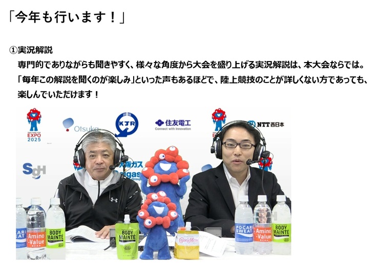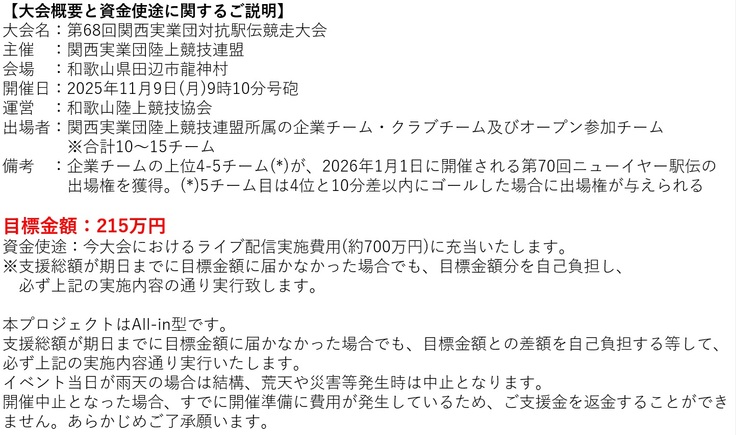 11月9日に開催する第68回関西実業団駅伝にてライブ配信を実施。 集まった資金はライブ配信の費用(総額約700万円)に充当。