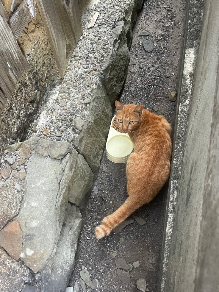 バス停裏の駐輪場で2ヶ所餌を置いてます。元々餌やりしてた場所からまぁまぁの距離ですが移動した子がいたからです。その子目当てに餌やりしていたら他の子も食べに来て2ヶ所にしました。1ヶ所は駐輪場裏に置いてましたが、数日前に誰かに撤去されていました…極力目に触れない場所に、と思い、塀裏溝に今は置いてます。