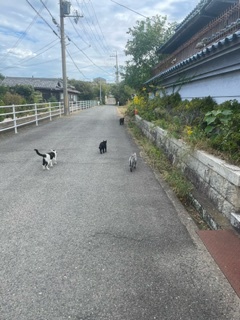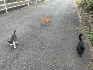 餌やりに行くと皆道に広がります。その時車が通るとかなり危険です。近隣の方は分かっているので徐行してくれますが、徐行しない方もおられます。車が来たら退くとでも思っているからでしょう。この辺の猫たちはのんびりしていて退かない子もいます。急に飛び出す子もいて毎日ヒヤヒヤしています。