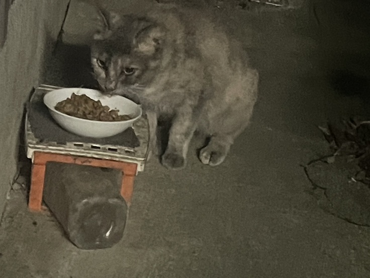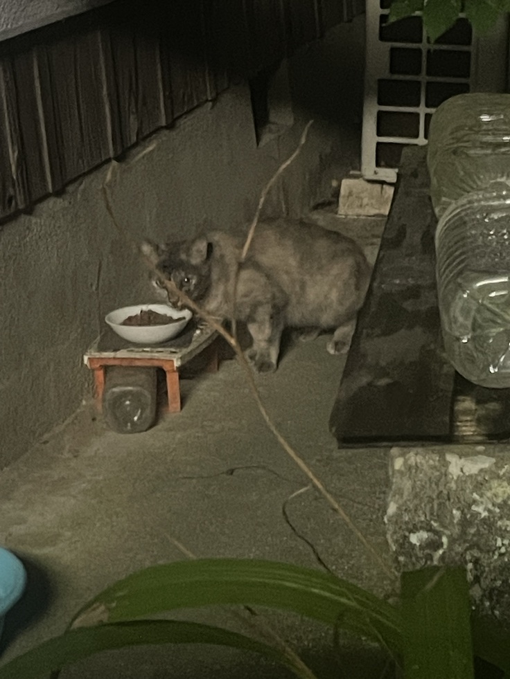 こっそり食べに来てる子がいます。目が合うと素早く逃げます。近所で餌やりしてるお宅にいる子と同じ柄のパステルサビです。その子だと手術済みなんでいいんですが、別猫でしたら捕獲してTNRです。近所の方に確認してみます。近くの別場所の餌置き場にも黒い子が来ているようで、尻尾だけ見えたんですが、モフモフだったので見かけない子だと思います。こちらは又現れるか様子見です。