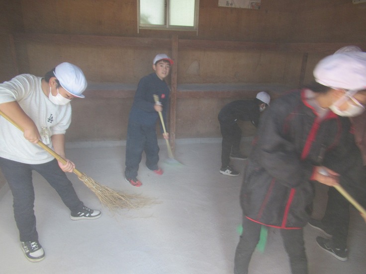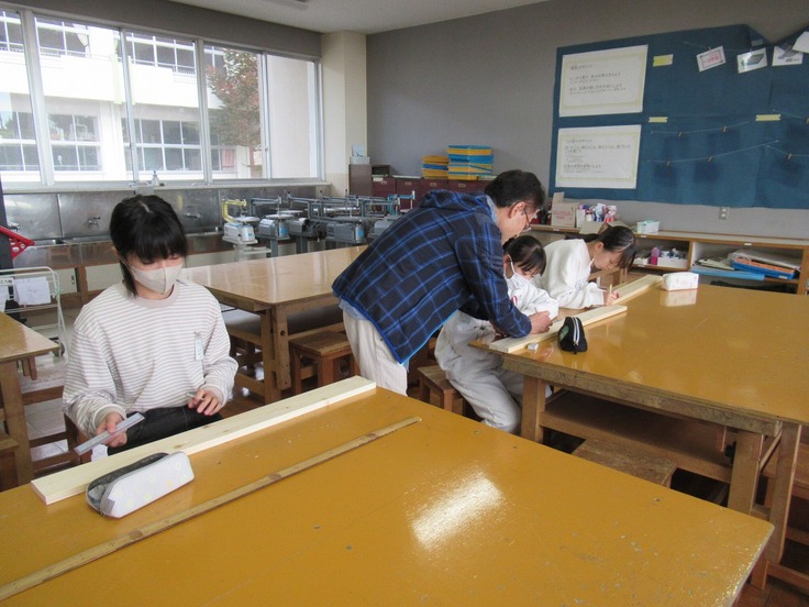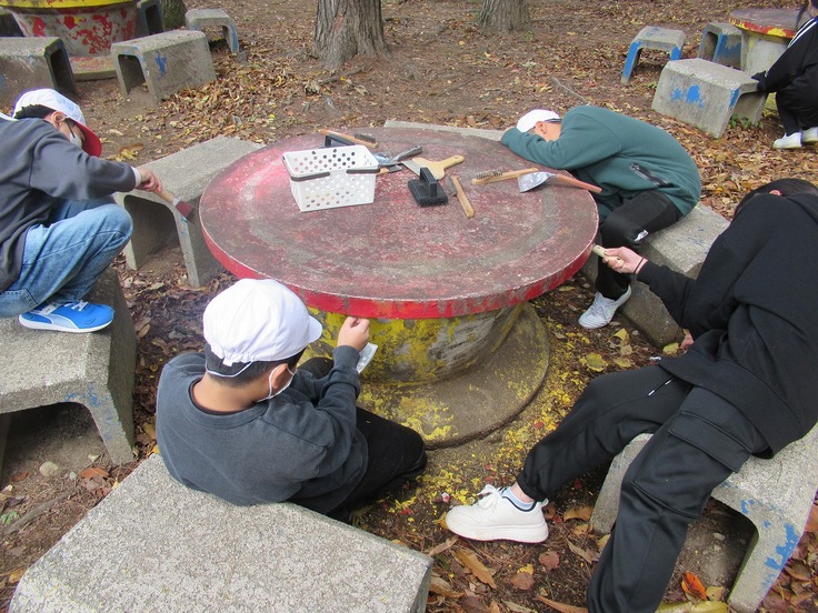 〇学ぶ場…森の教室にある机と椅子の劣化した塗料を剥がし、新たにペンキを塗りなおす準備をしています。商工会の青年部の方々に御協力いただき、機械を使って机を綺麗に削っていただいています。また、地域学校協働活動推進員の方に御協力いただき、森の教室に掲示するネームプレートや時計に製作にも取り組んでいます。