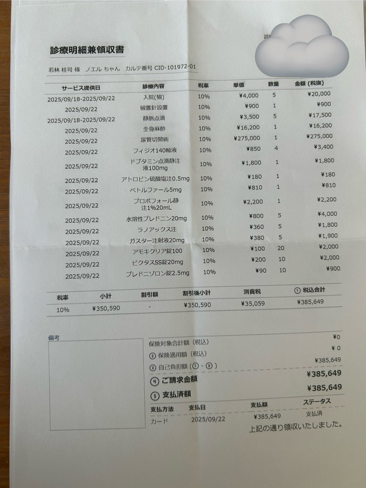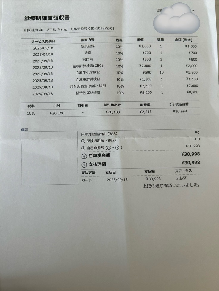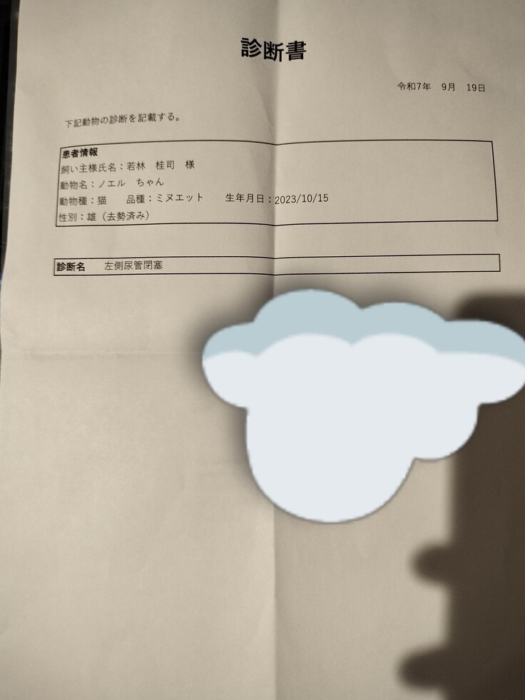 突然の事で頭が真っ白になり、病院での別れ際に、「おいていかないで」と言うようなノエルの寂しそうな顔を見てしまい、帰りの車の中で思わず泣いてしまいました。