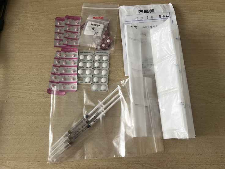 2022.8~ 皮膚に腫瘍が出来て、他の病院で手術となった時、心音を聞いた医師がすぐに投薬した方が良いと言われそこから投薬が始まります。アトピー性皮膚炎の薬も飲んでいるので、お薬が多く飲むのも大変です。