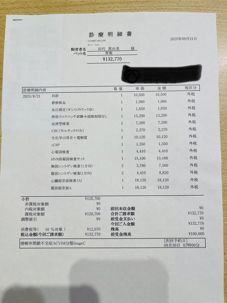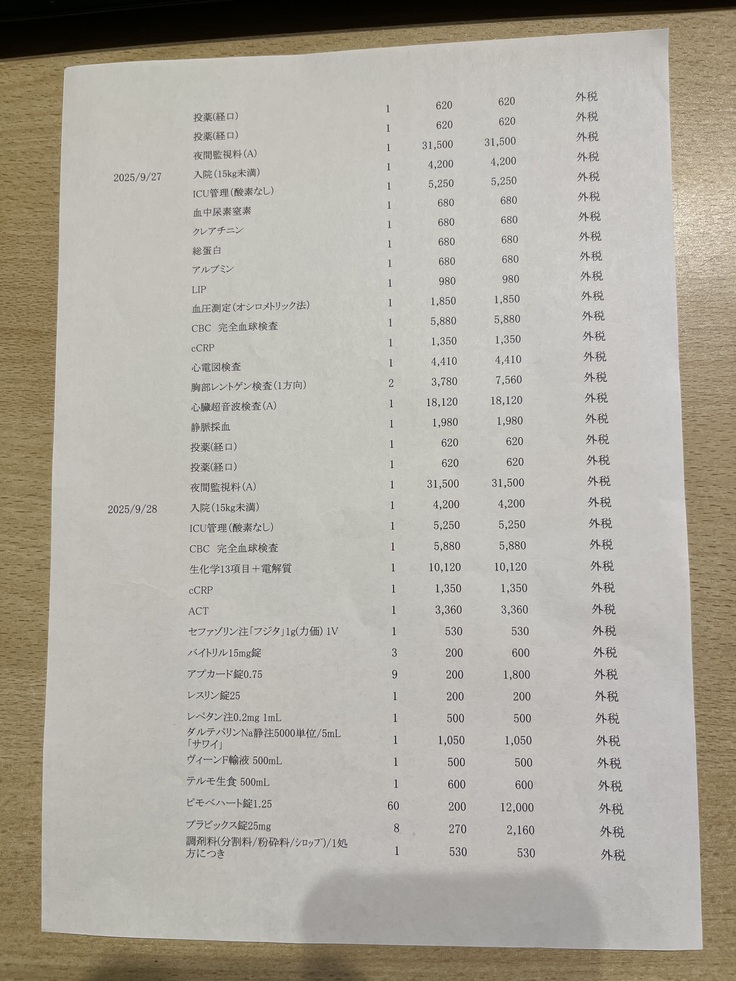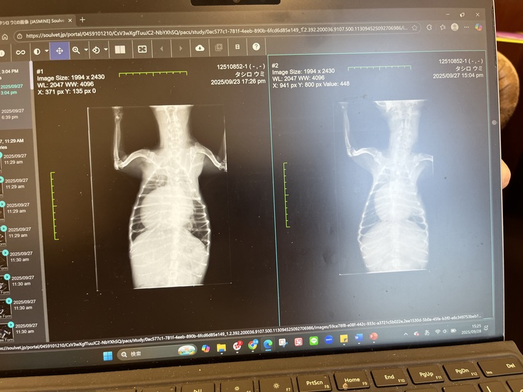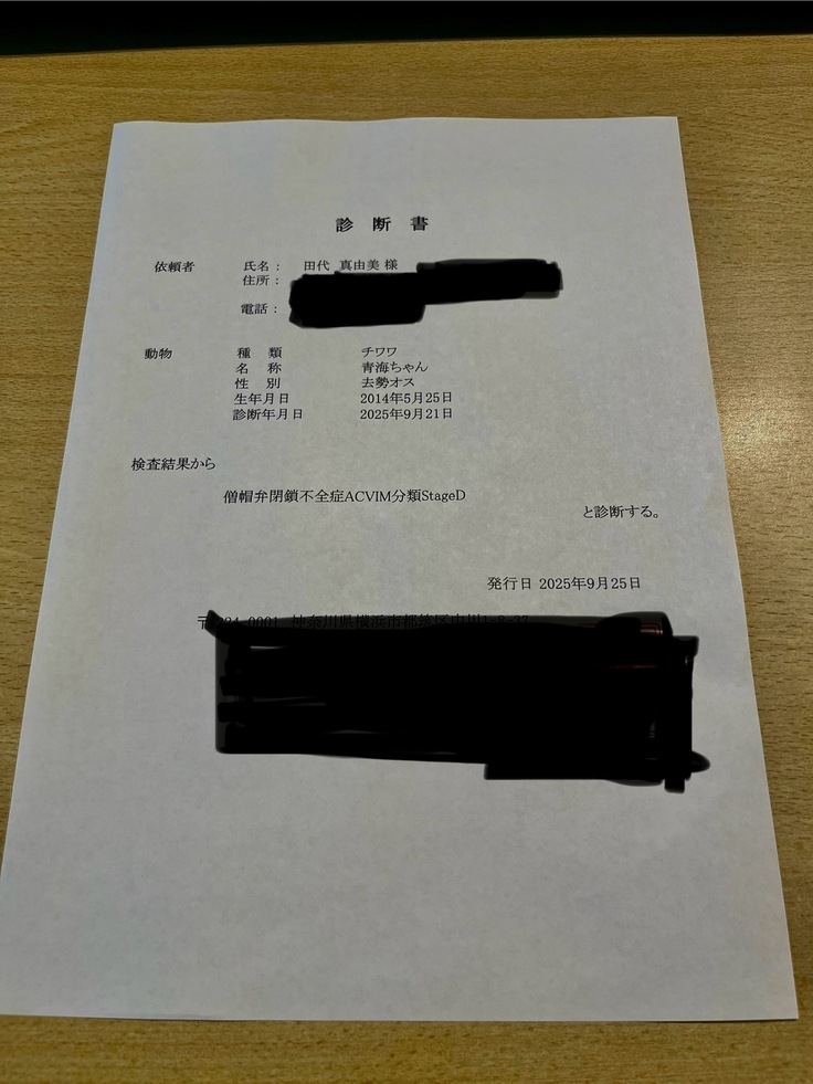 2025.9.20 レントゲンを撮りましたが、心臓は全く小さくなっておらずここまで何も反応が無いともう外科的手術しかないと仰って「ただ、とても高額なのでそれが出来なかったからと言って、ダメな飼い主さんでは無いです。十分やっています」と先生に励まされました。