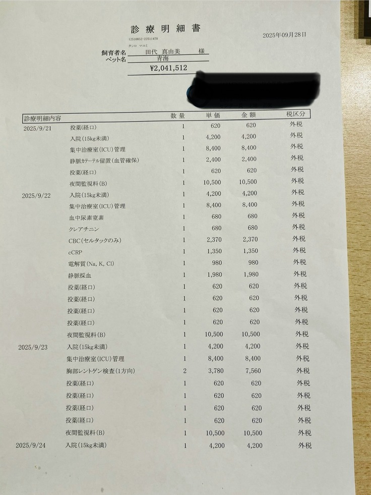 月に3,4万位が医療費としてかかっておりました。一昨年には、多剤耐性菌膿皮症で完治に1年間かかり、その間にも毎週のように