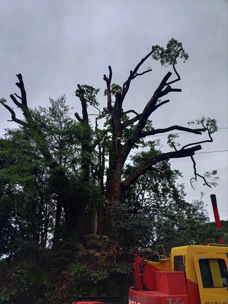 2023年5月、社の解体のあとに、ご神木のクスノキが大きくなり過ぎ、お宮の土台が盛り上がって崩壊してきたのを止める伐採をしました。また、大きくなり過ぎた樹冠の枝が折れたとき、付近の住宅の屋根に落ちたこともありました。
