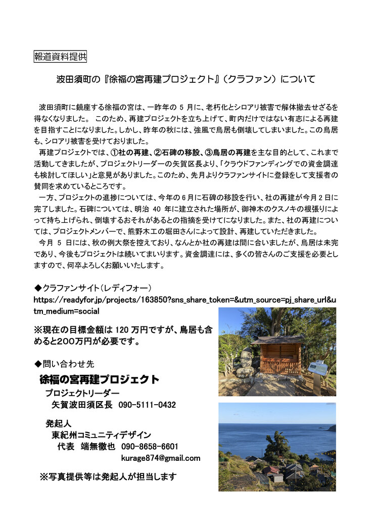 送料込10,000円以内になりますが、わたしが選んだこの地域の逸品をお礼として送付します。たとえば、素材と製法にこだわった干物類(販売されている店舗はお任せになります)や、この地域でしか手にできない柑橘類(販売されている店舗はお任せになります)、またこの地域でしか産出されない那智黒石の作品などを予定しております。なお、社の芳名板に名入れをさせていただきます(希望の確認をします)。
