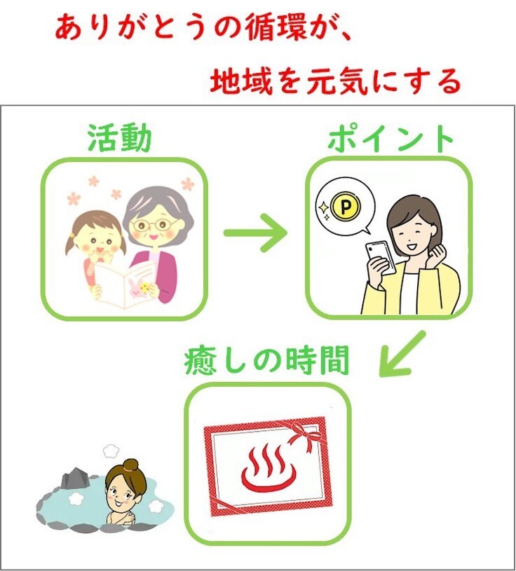 このポイントは、温泉旅行や地域の癒し体験と交換できる仕組みです。