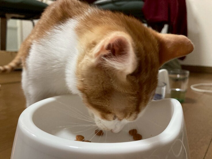 帰宅後のわかもれの様子です。家のカリカリもすぐに食べていました。