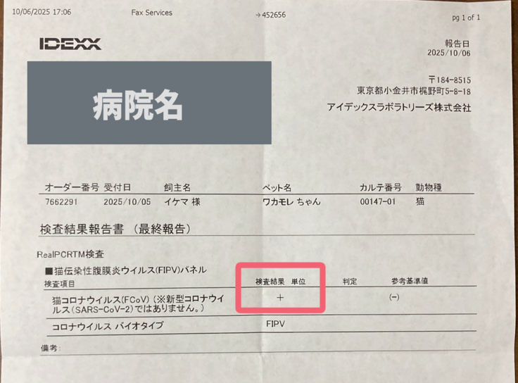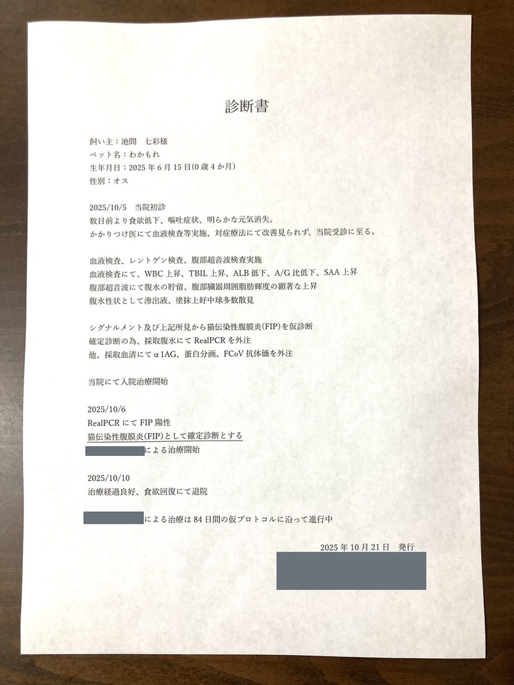 朝一番で別の病院の診察を受けた結果、「猫伝染性腹膜炎(FIP)」だと診断されました。