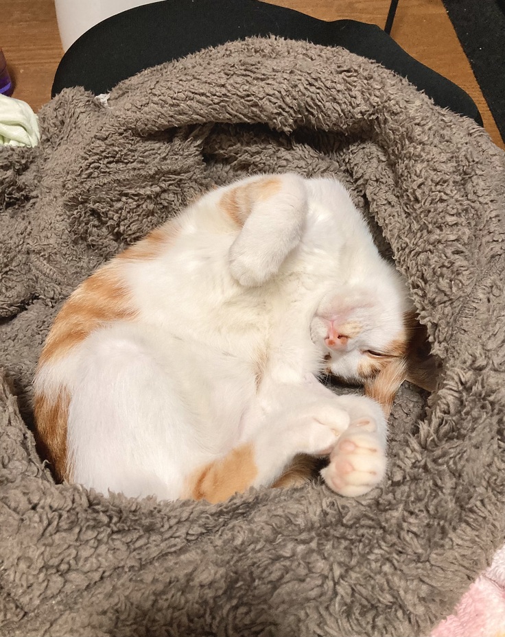 寒くなってきたので人用の着る毛布を出しましたが、手触りが気に入ったのか早速寝床にされてしまいました。