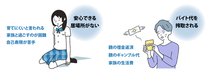 「育てにくい」と言われ、家庭に居場所を失う子、家族と過ごすことが難しい子、自分の思いをうまく表現できず、誤解から居場所を転々とする子が多くいます。さらに、働いても――親の借金返済のためギャンブル代のため家計の穴埋めのためせっかくのバイト代を搾取されてしまう子もいます。アミネスホームに来る子どもたちの7割以上は被虐待児です。「誰も信じられない」「頼れる人がいない」「なぜ自分は生まれてきたのかわからない」――そんな思いを抱えながら、生きています。