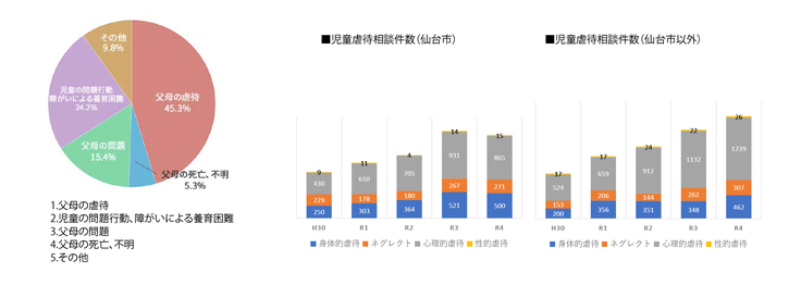 親からの虐待が全体の約半数を占めます。 10代後半まで虐待を受け、不適切な養育を長い間受けてきた子どもたちが多くいます。 令和4年度に宮城県(仙台市を除く。)の児童相談所が対応した児童虐待相談対応件数は、2,034件となっています。 令和3年度の1,764件から約15.3%増加している状況です。