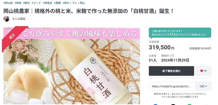 “6次産業化”は簡単な道ではありません。 農業、加工、販売――そのすべてに責任を持ちながら、日々の農作業と両立していくことは、心が折れそうになることが多々あります。それでも、昨年ご支援くださった皆さまの声が、今年も私の背中を押してくれています。 苦しみながらも、着実に、地域の課題解決につながるプロジェクトとして育てていきたい。 その第一歩として、今年の「白桃甘酒プロジェクト」、ぜひご注目・ご支援をお願いいたします!