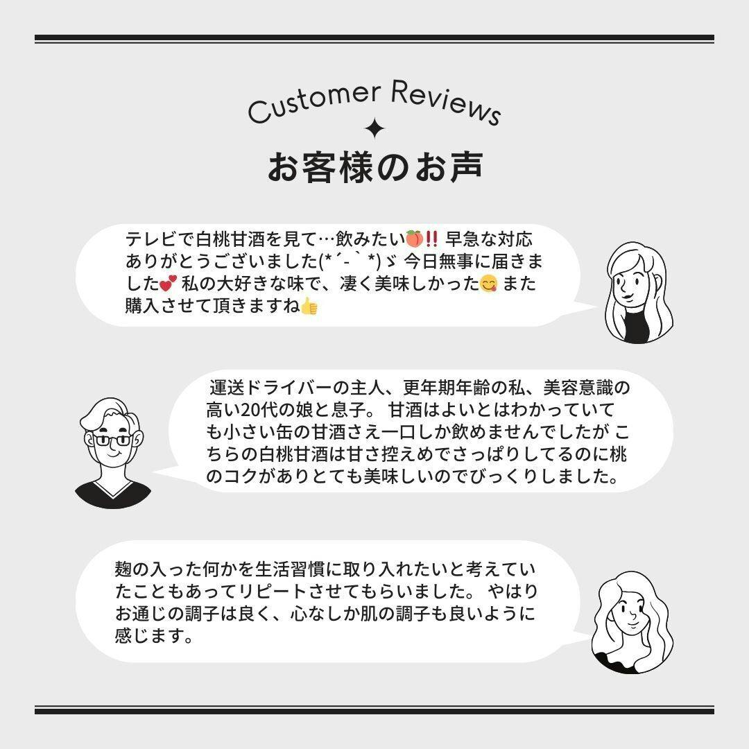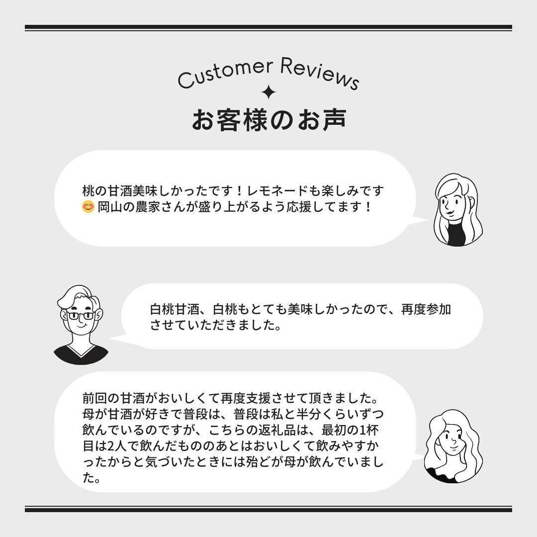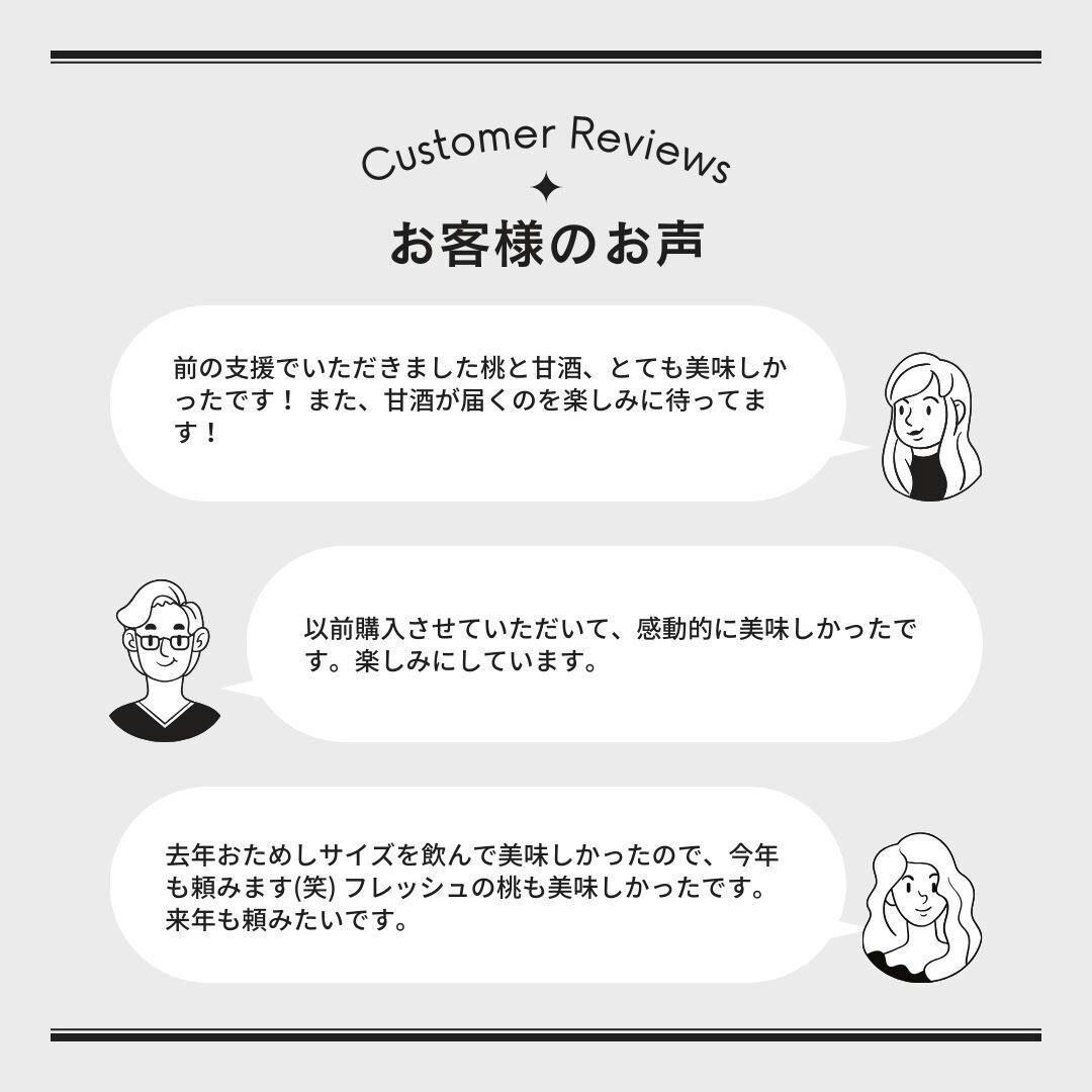 今年の甘酒も、大分県佐伯市の老舗酒蔵「ぶんご銘醸」様にて製造いただきます。 素材は昨年同様、なんば農園の白桃・厳選された国産米・米麹のみ。 砂糖等は使わず、昔ながらのやさしい味わいです。 昨年ご好評いただいた「飲みやすさ」はそのままに、桃の風味等にもこだわり、さらにバー ジョンアップを目指して試作・調整を重ねました。もともとは妊娠中の妻の一言から製造を決意した経緯もありますが、今では多くの方に飲んでいただき、沢山の嬉しいお言葉まで頂戴しておりますので、その一部をご紹介させていただければと思います。