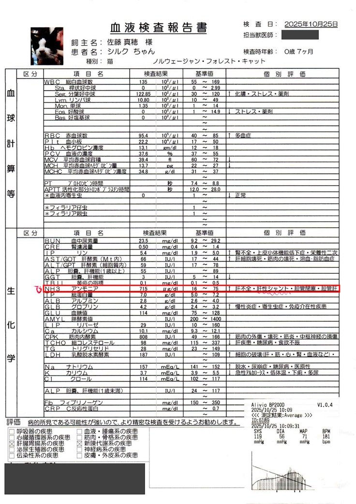 アンモニア数値が異常に高く、てんかん症状を引き起こしているとのことでした。