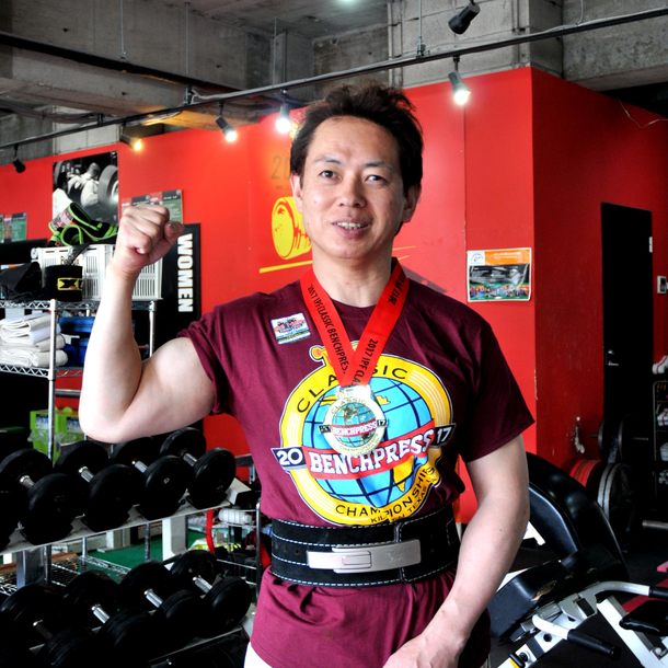 年齢は60歳。普段はワークスアプリケーションズという会社の社員としてヘルスキーパーの仕事をしながら、市内のスポーツジムで毎週2度、ベンチプレスのトレーニングを行っています。