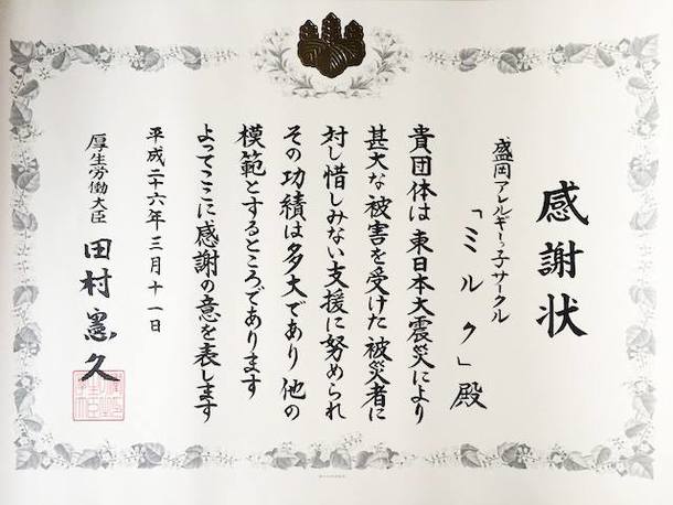 岩手県で唯一のアレルギー児親の会であった「盛岡アレルギーっ子サークル ミルク」は支援活動を開始。支援物資や支援金は日本だけでなく海外からも届きました。岩手県内、約200か所の避難所にSOS連絡先を書いたポスターを貼り、連絡があった方にはアレルギー対応食品を届けました。アレルギー用ミルクがなくて困っている方、小麦アレルギーがあり菓子パンや炊き出しのラーメンが食べられない方。皆様からいただいた支援物資を必要とされている方のもとにお届けしました。