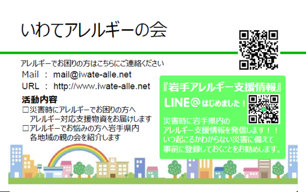 いわてアレルギーの会では盛岡市、久慈市、奥州市、田野畑村と岩手県内の各地域で活動するアレルギー児親の会が集まり、アレルギー患者が安心して生活できる社会の実現を目指して活動を行っています。
