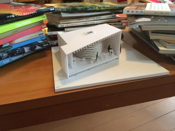 模型持って土地にいって、えっとここがこうで、こう入ってとかいろいろ妄想してます。写真は模型と店舗のイメージをするのに集めた本です。