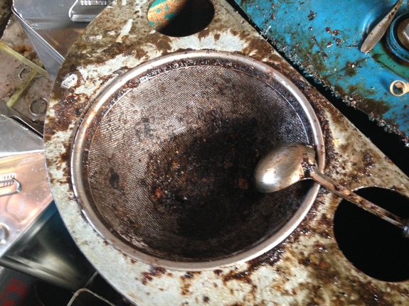 次に、集めた油を金網でこします。