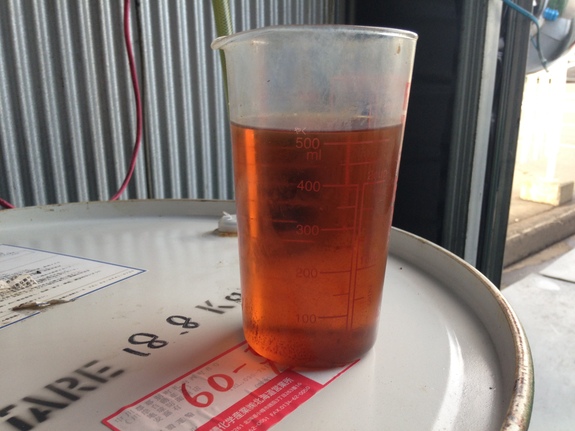 これが完成したBDFです。100ℓの燃料を作るのに約6時間かかります。出来上がりを見ると水割りで飲みたくなるほど愛おしいのです。これで車が走るんですよ!感動です。