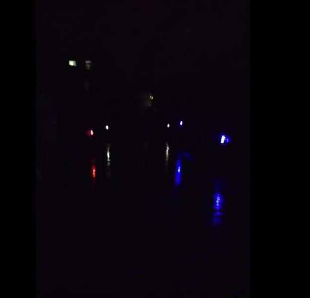 当日は雨模様で道路が雨で濡れており防災ライトの光が道路に反射してい