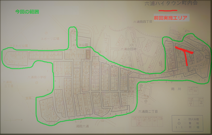 この写真が前回の範囲赤い線の場所、今回が緑の線の範囲です。