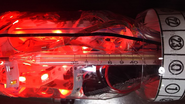写真は、ペットボトルの中に体温計を入れて点灯させたときの内部温度を測定している写真です。