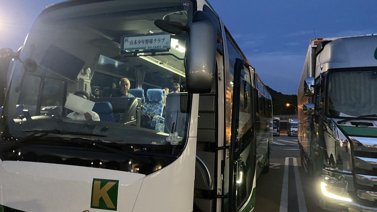 眠い目を擦りながらバスに乗り込むゆるキャラ達。