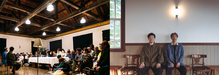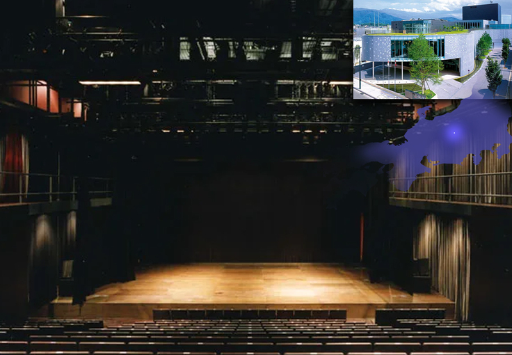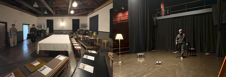 「マッチョと亡霊」公演前 左:旧宮島村役場 ( 富山 ) 右:まつもと市民劇場小ホール ( 松本 )