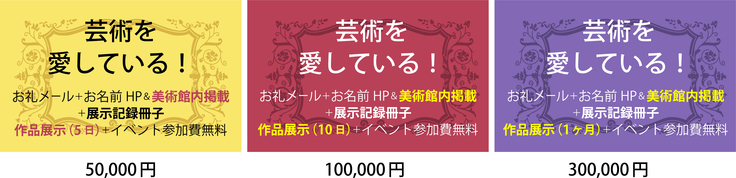 「1つだけ美術館」のホームページ掲載。または、「1つだけ美術館」ホームページ&美術館内の壁面に、お名前(ニックネームやイニシャルも大丈夫です)または会社名を掲載させていただきます。