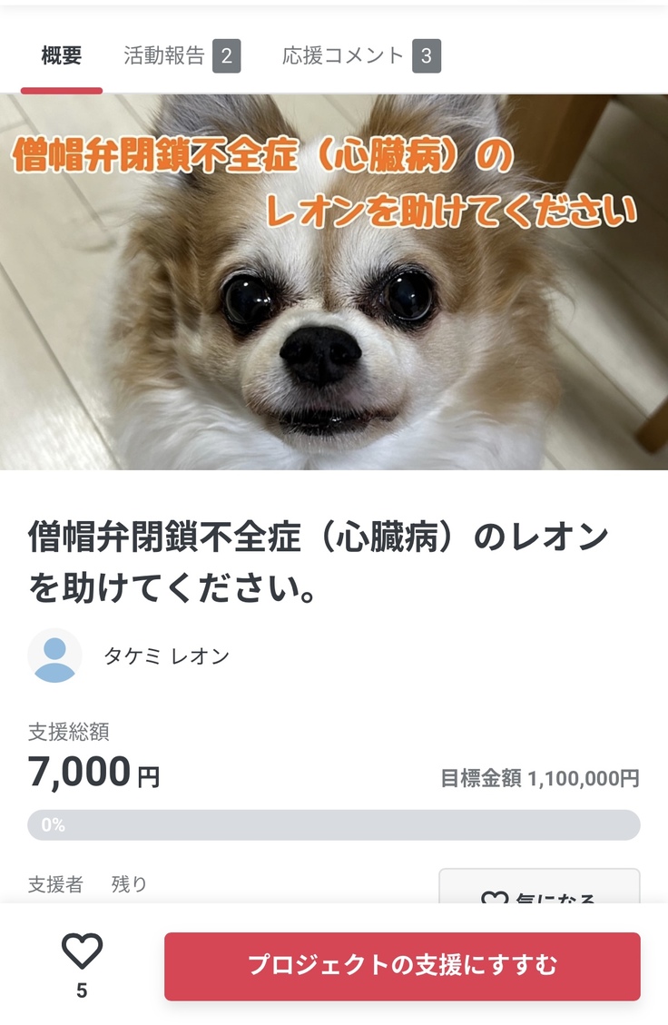 ※代理支援でいただいた支援金は、プロジェクトが不成立になった場合でも、返金せずレオンのこれまでの治療費に充てさせていただきます。