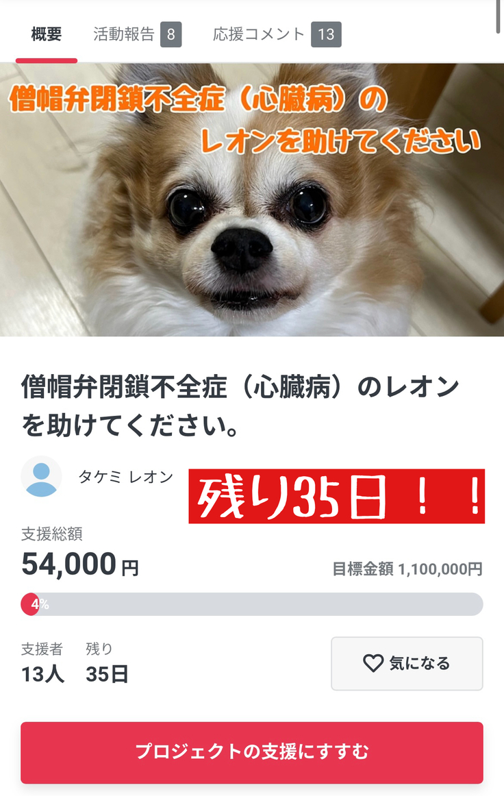 ※代理支援でいただいた支援金は、プロジェクトが不成立になった場合でも、返金せずレオンのこれまでの治療費に充てさせていただきます。