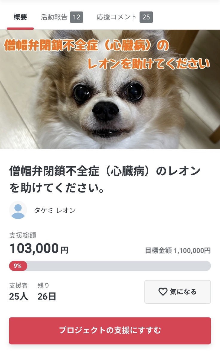 ※代理支援でいただいた支援金は、プロジェクトが不成立になった場合でも、返金せずレオンのこれまでの治療費に充てさせていただきます。