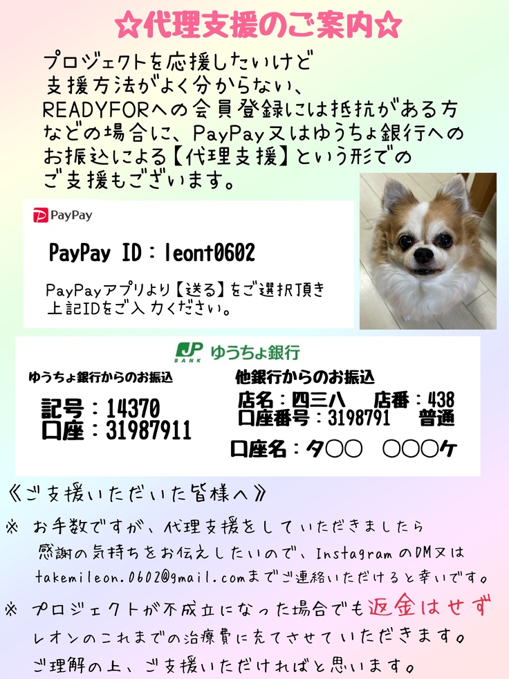 ※代理支援でいただいた支援金は、プロジェクトが不成立になった場合でも、返金せずレオンのこれまでの治療費に充てさせていただきます。