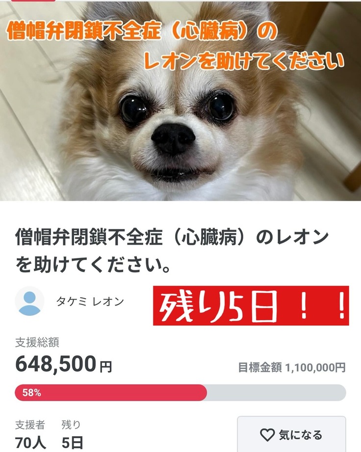※代理支援でいただいた支援金は、プロジェクトが不成立になった場合でも、返金せずレオンのこれまでの治療費に充てさせていただきます。